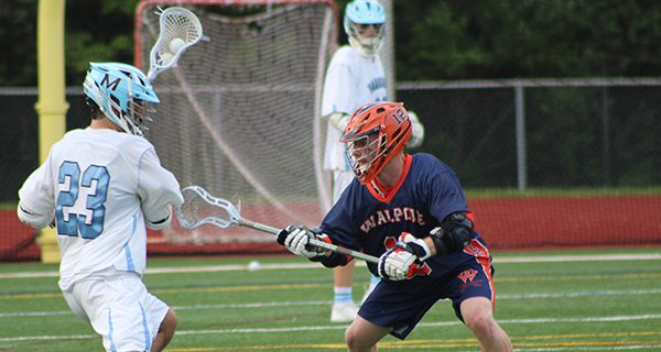 Walpole’s Ethan Kelley (12) defends against Medfield’s Brian Abely (23) midway through the second quarter. Photos by Mike Flanagan[/caption]