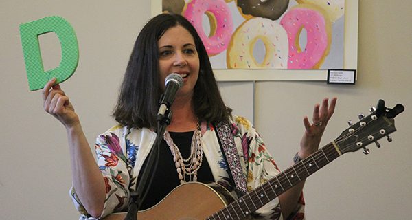 Peasley holds up one of her letters looking for a verb that starts with “D” Photos by James Kinneen[/caption]