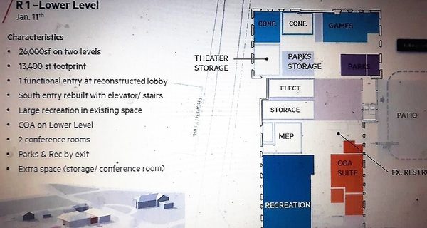 The R1 is the first of the renovation options, and reuses both the 1910 and 1934 buildings. The COA would generally stay where it currently is, and the recreation space reuses some existing court space.