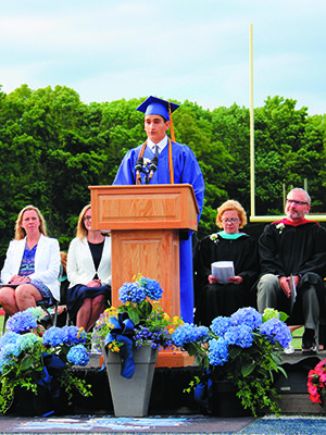 The class of 2018 President, Jason Zavras, delivers his speech at the Dover Sherborn High School graduation. Photos by Laura Drinan