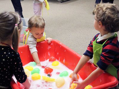 For a sensory development activity, participants at the Dover Town Library’s ‘Super Awesome Fun Time’ play with toys in soapy water.