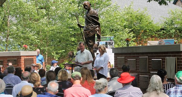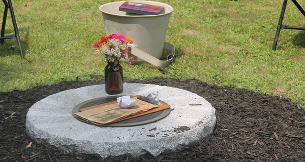 Sunday afternoon was a busy one at Sherborn’s Pacifist Memorial, as the day featured the dedication of new bronze plaques in honor of John Lewis, Helen Keller, Julian Bond, Richard Gregg, Pete Seeger, Barry Crimmins, Paramahansa Yogananda, and Britt and Nan Pendergrast, the presentation of the International Courage of Conscience Award to Senior Minister and Executive Director at the UU Urban Ministry in Boston Mary Margaret Earl, the installation of The World Peace Time Capsule which is scheduled to be opened in the year 2121 and the blessing of the Global Pandemics Bereavement Stone and Carriage.