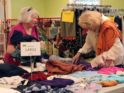 Two thrift shoppers sift through the tables at the Good As New Shop’s half price sale.