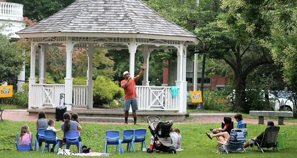 While Kurt Jackson is a great storyteller, for his newest program called “Kurt Jackson Presents a Kids’ Storytelling Spectacular!”, he is mostly a story facilitator who has handed off much of the actual storytelling duties to kids. Noting how much he missed telling stories in public during the COVID lockdowns, Jackson explained he “loves to just sit back and be told a story” - so he developed this new program wherein kids would be the primary storytellers. He debuted the program last Tuesday night at the gazebo outside the Medfield Library.