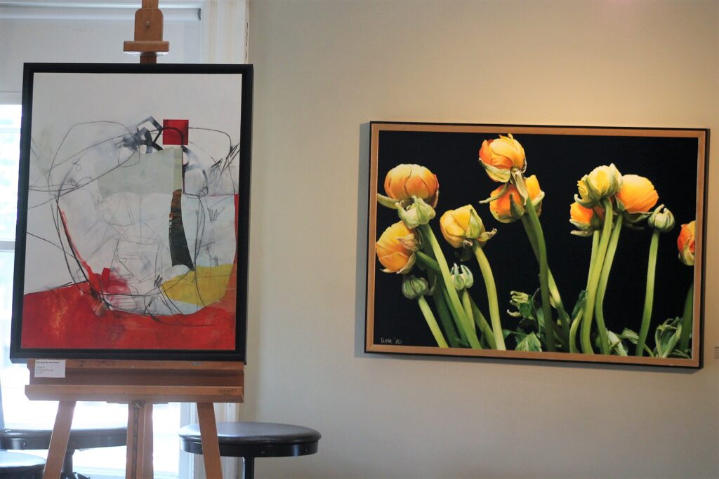 One of the more striking images is Lissa Banks’ “Parting Company”, a seemingly simple image of flowers against a black background that really sticks out in the room because of its bold background. On her website, Banks explained that she was considering pulling the flowers together but that doing so didn’t seem right in the era of social distancing.