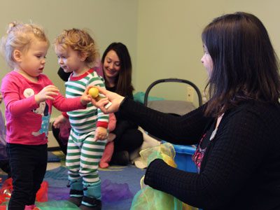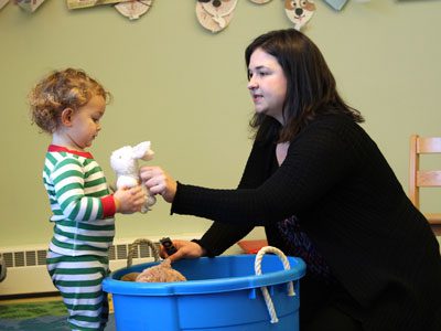Head of Children’s Services Bernadette Foley gives a toddler a stuffed animal rabbit to hold onto while the group sings ‘Old MacDonald.’