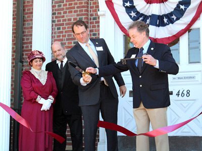 Small stood on the original steps of the library with his wife, Cynthia, who played Dailey’s oldest daughter, May Belle, and the Medfield Board of Selectman. After Dailey presented the selectmen with the keys to the library, they cut the red ribbon to celebrate the grand opening of the public library.