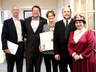 Left to right: Richard DeSorgher, Rep. Shawn Dooley, Kristen Chin, Steve Small (as Granville Dailey), and Cynthia Small (as May Belle Dailey), celebrate the library’s one hundred years with a resolution from the Commonwealth of Massachusetts.