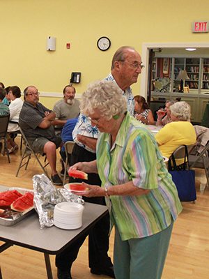 Visitors to the Center came together to share a delicious meal while connecting with old friends. Though it was pouring rain outside, the weather didn’t stop volunteers from braving the elements to cook up mouth-watering Italian sausages served with potato salad and watermelon slices. About 70 people came out to enjoy the day.