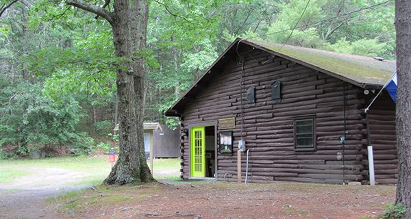 A bright door, painted in the Trustees' unmistakable green, welcomes visitors to the Chickering Cabin Visitors Center.