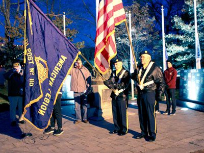 Just after dusk, the American Legion Post 110 hosts a Veterans Day ceremony at the Baxter Park memorial.
