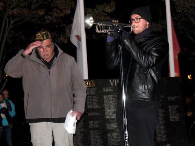 Justin Plakias, a Medfield student, performs the taps to close the Veterans Day ceremony at Baxter Park.