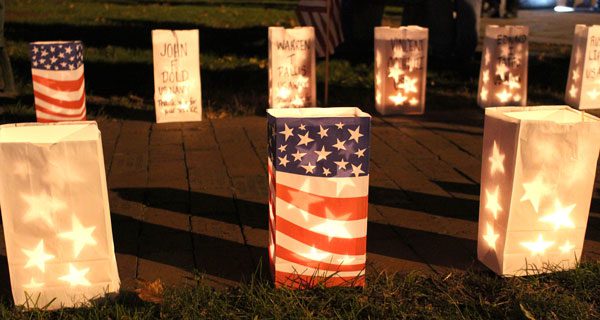 Just after sunset, dozens met at Baxter Park in Medfield to remember and honor the town’s veterans on November 11. From the street, a soft glow lined the stone pathways that led to the memorial in the park. As those joining the ceremony came closer, they quickly realized the lights were coming from luminary bags decorated with the names of those of have served and lit with candles.