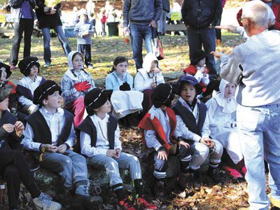 Dressed in their Pilgrim outfits, Wheelock third graders play team-building games with seventh grade Girl Scouts.