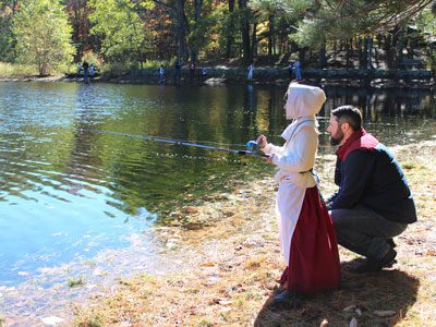 A miniature Pilgrim patiently waits for a tug on her line at the Wheelock School’s annual trip to Rocky Woods.