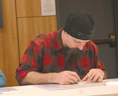 Block printing is typically done with linoleum or wood, with designs carved into it to become stamps to make art prints with ink. Nydam takes a different, and safer, approach and showed the patrons how to create their own rubber block prints. With it you only need a rubber block, pencils, scrap paper, caring tools, ink plates, ink, and rollers. It sounds like a lot, but Nydam broke it down in an engaging, easy to understand way that inspired the crowd to create something new.