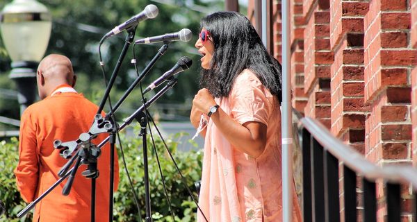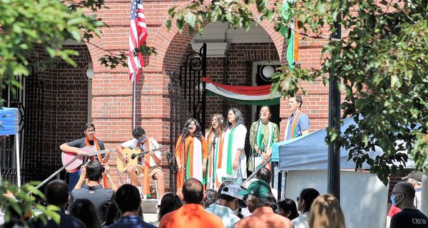 With in-person activities returning to Needham this year, ICON decided to hold a celebration of Indian Independence Day. But with Needham Farmers Market still running at the Town Hall, ICON had only about a half an hour for their celebration before the market's band took the stage. But pointing out that it both brought more of a crowd to the farmers market - and that the market brought some people who might not have known about the Independence Day celebration to it - ICON Treasurer Vipul Bhushan explained he was happy with the spot.