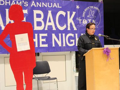 Lieutenant Belinda Carroll of the Needham Police Department has spoken at Take Back the Night for the past 11 years to show her support for raising awareness for sexual and domestic abuse.