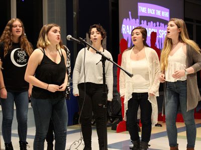 With REACH Beyond Domestic Violence and the Boston Area Rape Crisis Center (BARCC) partnering with Needham High on the event, Take Back the Night featured several guest speakers to share their survival stories. Lieutenant Belinda Carroll and State Representative Denise Garlick also spoke at the event, which incorporated performances from Needham High’s a cappella throughout the evening.