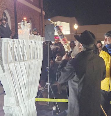 On Wednesday, December 17, an hour after the sun had set in the darkest part of the year, members of Needham’s community gathered at Town Hall for the lighting of a striking ice menorah. Constructed entirely from blocks of ice that same day, the menorah was a sharp contrast to the flame featured in the community’s Chanukkah festivities.