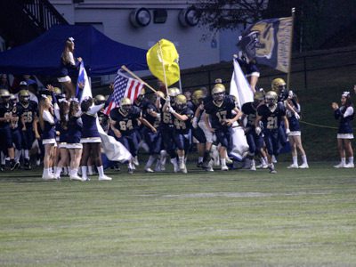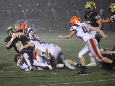 Just before the game’s opening kickoff, a torrential downpour tore through Memorial Field. The onslaught of rain continued until about midway through the second quarter when the pouring turned to a light sprinkle. However, the field was completely soaked due to its location at the bottom of the hill at NHS, and the entirety of the game saw sloppy play on both sides, with fumbled snaps, players slipping, and play-calling turning to mainly inside runs.