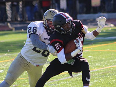 Needham’s John Marshall (26) attempts to corral Wellesley’s D’Aunte Moore (29) on a second quarter punt return. Photos by Michael Flanagan