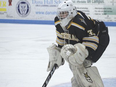 Needham goaltender and senior captain Dylan Jones (35) keeps an eye out and protects the near side of the cage late in the first period.