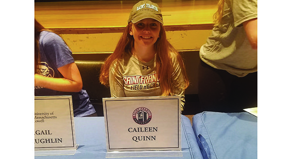Caileen Quinn (pictured) is all smiles with her new lid and t-shirt after signing to play field hockey at St. Francis. Photos by Twitter, @WalpoleAD