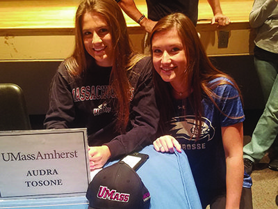 Senior captain of Walpole field hockey and due-to-be captain of Walpole girls lacrosse this spring, Audra Tosone, signed her NLI to play lacrosse at UMass-Amherst. Caileen Quinn signed to play field hockey at St. Francis (New York).