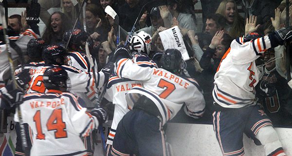 The Rebels continued to work the puck around in the CM end in the first minute of the overtime period, and pressure in front of the net forced the Knights to ice the puck, setting up an offensive zone draw for the Rebels. Owen Hunter won the draw back to Cam Martin just inside the face-off dot, who stepped in and snapped the puck over the CM goaltender’s left shoulder to win the game for Walpole and send the arena into a state of insanity. After the Rebels mobbed Martin at center ice, the team went over to the stands next to their bench and celebrated with the Walpole Brigade, who came up to Chelmsford in full force.