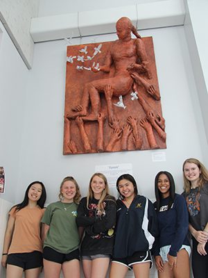 (Right to left) Michelle Despres, Maya Vogt, Kayla Talcoff, Hanna Levy, Izzy Mersky, and Helena Zhang with their sculpture, 'SPEAK!'[/caption]