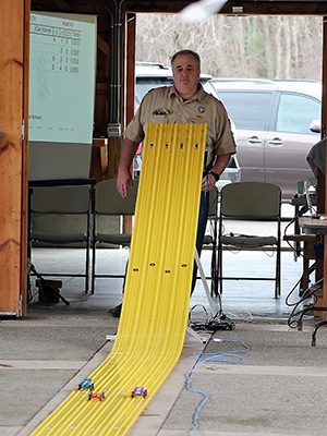 But because some people are still at high risk because of COVID-19, the Troop had a tripod at the end of the track that was recording a video. While you might think that was to prevent cheating or to confirm to the Boy Scouts of America that everything was done according to protocols, Keaney explained that it was actually being recorded because when COVID hit, they created a YouTube channel for grandparents who were too nervy about coming out to events, but still wanted to see how their young scouts did. Other high-tech additions to the derby included a plastic track (they used a wooden one for decades, but changed after it warped), sensors that digitally recorded times, and a projector scoreboard.