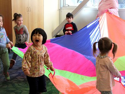 With the help of some of the parents in the room, the kids were able to run underneath the parachute as it flew into the air, showing off its brilliant rainbow colors. After the children came out from under the parachute, Yvette offered them the chance to sit in the middle and go for a spinning ride on top of the parachute as the adults pulled it in circles.