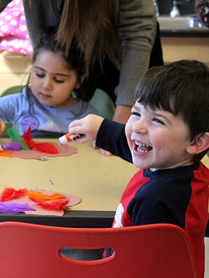 Some plucked their favorite colored feathers out of the basket, creating monochromatic turkeys, while others decorated the turkeys with any and every color feather. Others simply preferred to smear glue on their paper turkey and not stick any feathers on it at all.