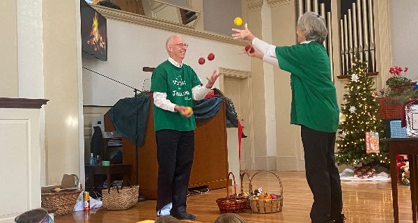 Spirited children, meanwhile, came upstairs after proudly finishing their shopping and having their gifts wrapped by helpful volunteers. They wrote letters to Santa and enjoyed the entertainment of the afternoon. Walpole residents Lois and Philip Czachorowski of Venture Into Juggling shared their skills with a crowd — and they included a holiday twist, involving children in juggling pie ingredients for Thanksgiving, including a pumpkin, sweet potato and apple. After the show, kids even got the chance to try their hand at juggling, too.
