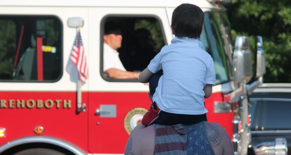 With throngs of families clad in red, white and blue lining the streets between the East Walpole fire station and Blackburn Memorial Park, various police cruisers, motorcycles, fire trucks and even a truck with Smokey the Bear on top drove along, waving to the kids and occasionally throwing candy. Because so many of the cars had loud sirens, many of the younger kids riding along had protective headphones on, with some using the headphone bands to hold in little American flags just above their ears.