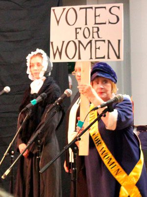 Local cast members Charlotte Eckler as Sarah Grimke, Libby Franck as Alice Paul, Ancelin Wolfe as Gloria Steinem.