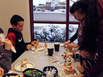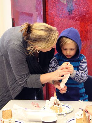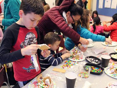 The Wellesley Free Library’s gingerbread house decorating event serves as a bonding experience for parents and children, without the mess in their own kitchen to worry about.