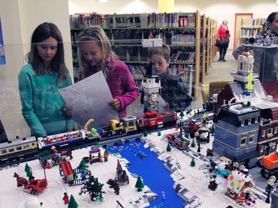 The boys, slowing their pace to a brisk walk, approached the display in the back of the room. They kneeled on the lounge chairs closest to the table and stared at it with wonder and fascination. The librarian announced that she would turn on the display, the LEGO Winter Village, in just a few minutes. Moments later, a crowd gathered around the boys.