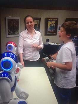 Worse, Weiler was assigned to be on the Robot Committee, a group of librarians charged with learning how to use and program the robots and develop curriculum. “This gave me a chance to really work in-depth with the robots,” said Weiler, “and I discovered that I loved it! The programming really is quite easy. It can get complicated and involve traditional programming with Python coding, but it doesn’t have to. After a month, we have programmed the robot to have conversations, walk around, even play Simon Says.”