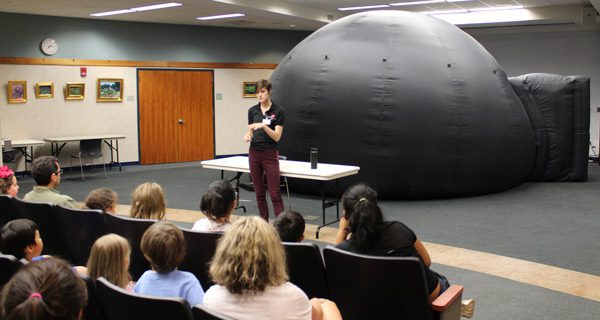 The Wellesley Free Library invited guests to gaze at the night sky inside the library’s Wakelin Room on Tuesday, August 22, just before sunset. That may sound a bit strange, as the only star visible before nighttime falls is the sun, and because the library visitors were indoors in a room without any skylights or windows to see outside. With the help of Emily from Boston’s Museum of Science and the traveling planetarium, though, it was possible to spend the afternoon under the stars.