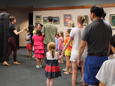 The traveling planetarium, also called the Star Lab, is a giant bubble with an entrance jutting out of its side. The Star Lab, much like a bounce-house, is inflated with air but holds a dome shape. Before entering the Star Lab, Emily greeted the curious event goers and established some rules so that the children and their parents knew what to expect during the event. After Emily ensured that everything was set up inside, she invited the families into the dark Star Lab, showing them where to sit as they entered.