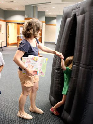 Wellesley Free Library visitors prepare for their indoor star gazing experience with the Museum of Science’s Star Lab.