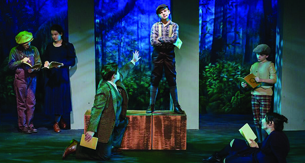 The Wellesley Theatre Project’s set conveyed the sense of a fantastical dream, with rows of tissue-paper leaves in multiple shades of green hanging from the ceiling, lighting that suggested the shadows of tree branches and leaves, and a spare middle section with a row of four columns that opened into an alternate configuration. Simple, lilting music gently welcomed the audience to the theater and put them in the mood for the adventures ahead.