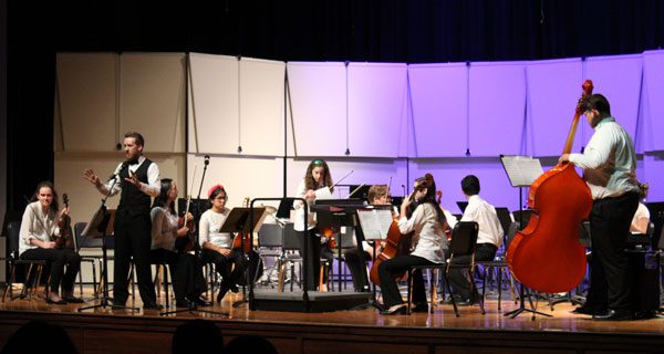 Westwood High School orchestra director David Dyson introduces the orchestra’s performance of an unexpected Disney song at the winter concert.