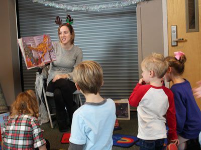 Westwood Public Library’s Lizzy McGovern holds a storytime for children at Winterfest, bringing a selection of festive picture books to inspire holiday cheer. Photos by Laura Drinan